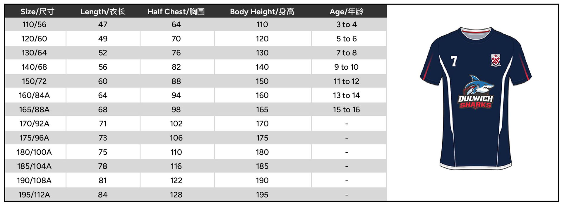 Size 110 or 120 or 130 or 140 or 150 or 160 or 165 or 170 or 175 or 180 or 185 or 190 or 195