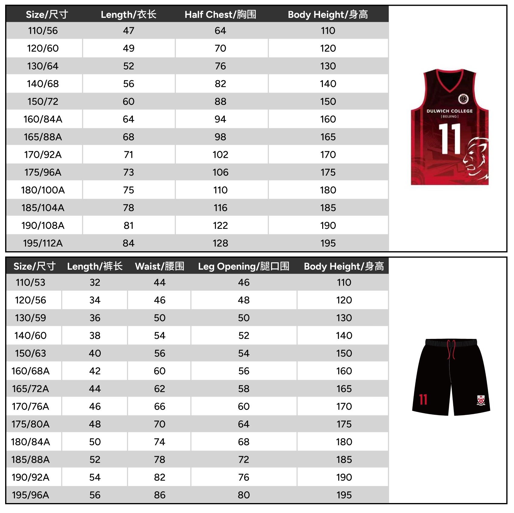 Size 110 or 120 or 130 or 140 or 150 or 160 or 165 or 170 or 175 or 180 or 185 or 190 or 195