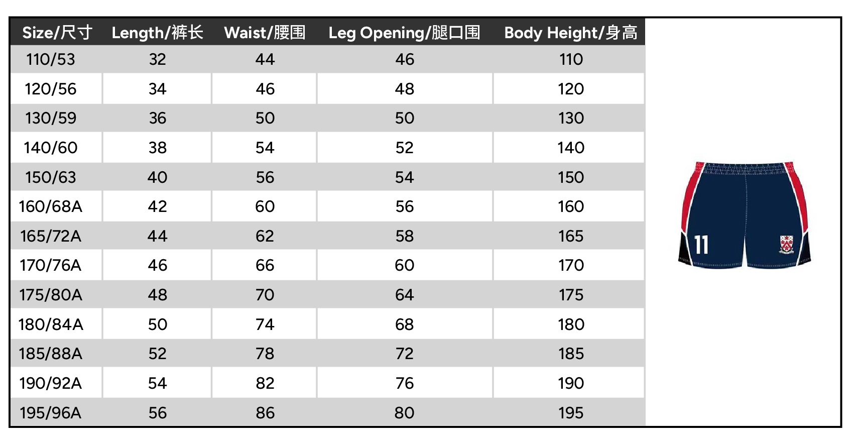 Size 110 or 120 or 130 or 140 or 150 or 160 or 165 or 170 or 175 or 180 or 185 or 190 or 195